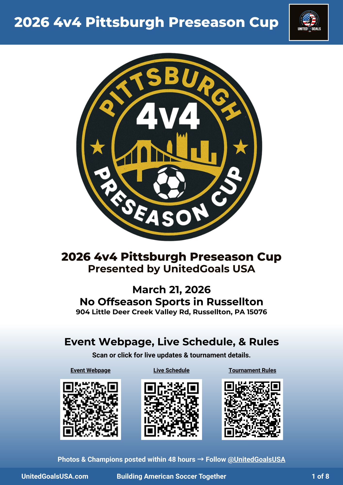 Whether you’re on the sideline in Russellton or following from home, our 4v4 Pittsburgh Preseason Cup Event Guide has everything in one place—competition preview, schedules, event apparel, vendors, future 2026 events, and a short note from me as we kick off the year.